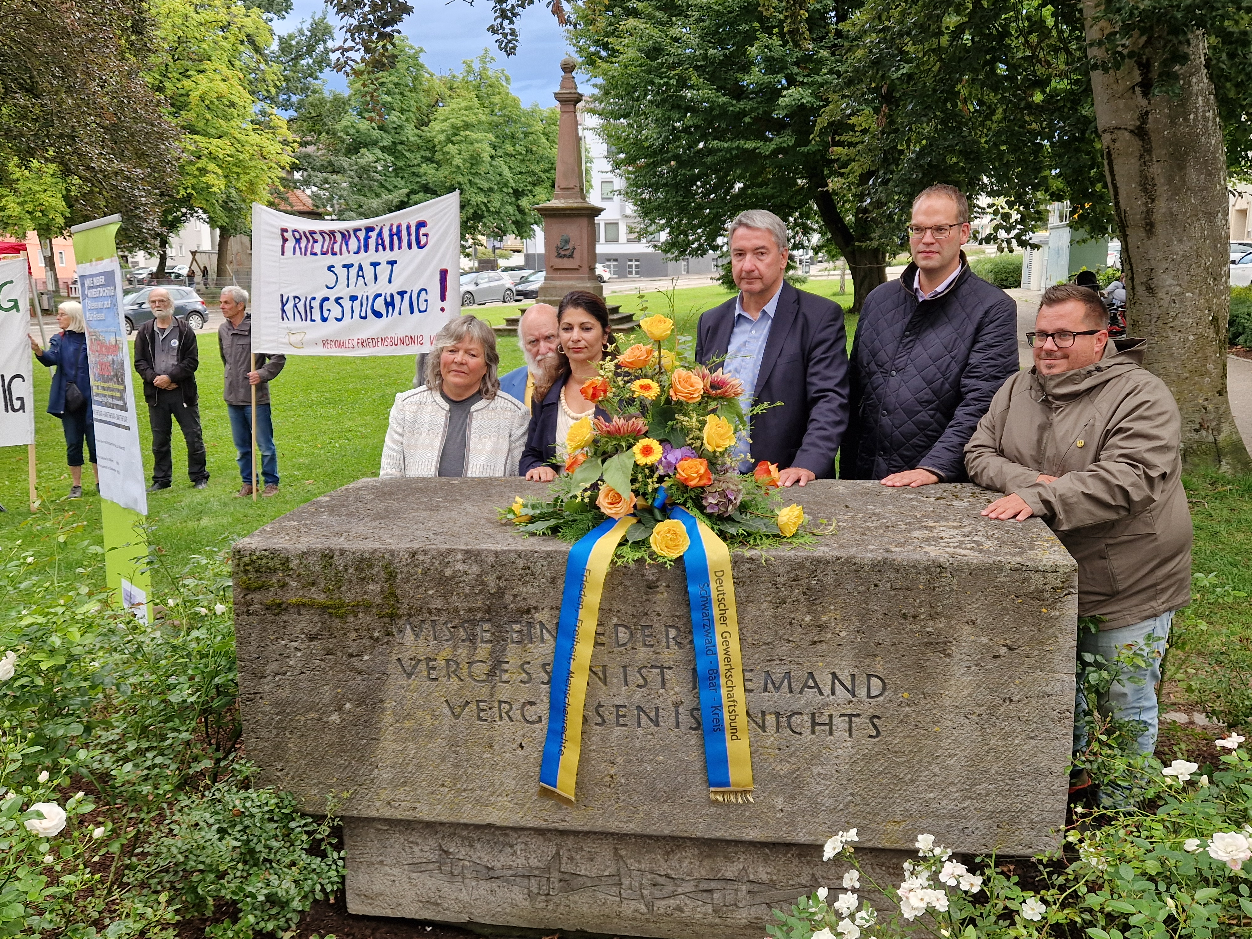 Beim gestrigen Gedenktag kamen rund 50 Personen zusammen. Andreas Merz, Vorsitzender des DGB Kreisverbands Schwarzwald-Baar, begrüßte die Anwesenden. Im Laufe der Veranstaltung waren verschiedene Redner präsent, unter anderem Bürgermeister Detlev Bührer, Martina Braun, Bündnis 90 / Grüne, und Nicola Schurr, SPD.