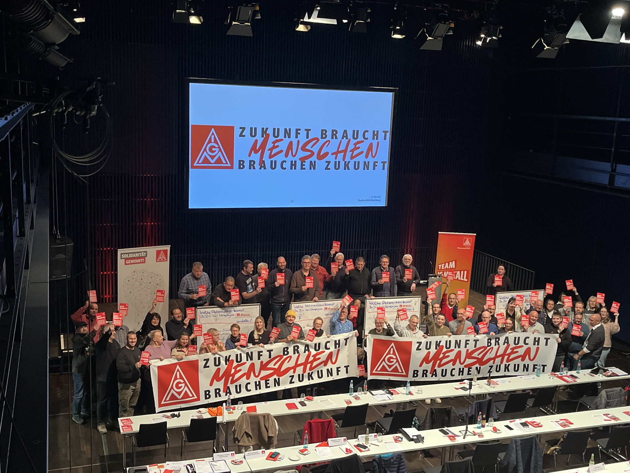 Die Delegierten zeigten am Ende der Veranstaltung die rote Karte. Mit dieser Aktion wollen sie ein Zeichen gegenüber den Arbeitgebern setzen, um zu signalisieren, dass sie gegen Stellenabbau, gegen Tarifflucht und gegen Verlagerungen sind.