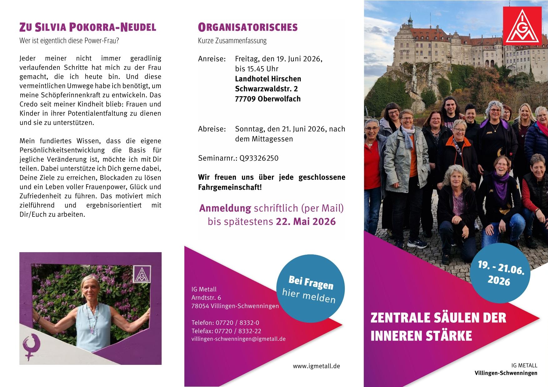 Das Frauenseminar 2026 mit Referentin Silvia Pokorra-Neudel findet vom 19. bis 21. Juni im Landhotel Hirschen in Oberwolfach statt. Eingeladen sind insbesondere Betriebsrätinnen, Vertrauensfrauen und Nachrückerinnen, die ihre persönliche und berufliche Entwicklung stärken möchten. Im Mittelpunkt des diesjährigen „Silvinars“ stehen die vier zentralen Säulen innerer Stärke: Selbstliebe, Selbstwert, Selbstvertrauen und Selbstbewusstsein.