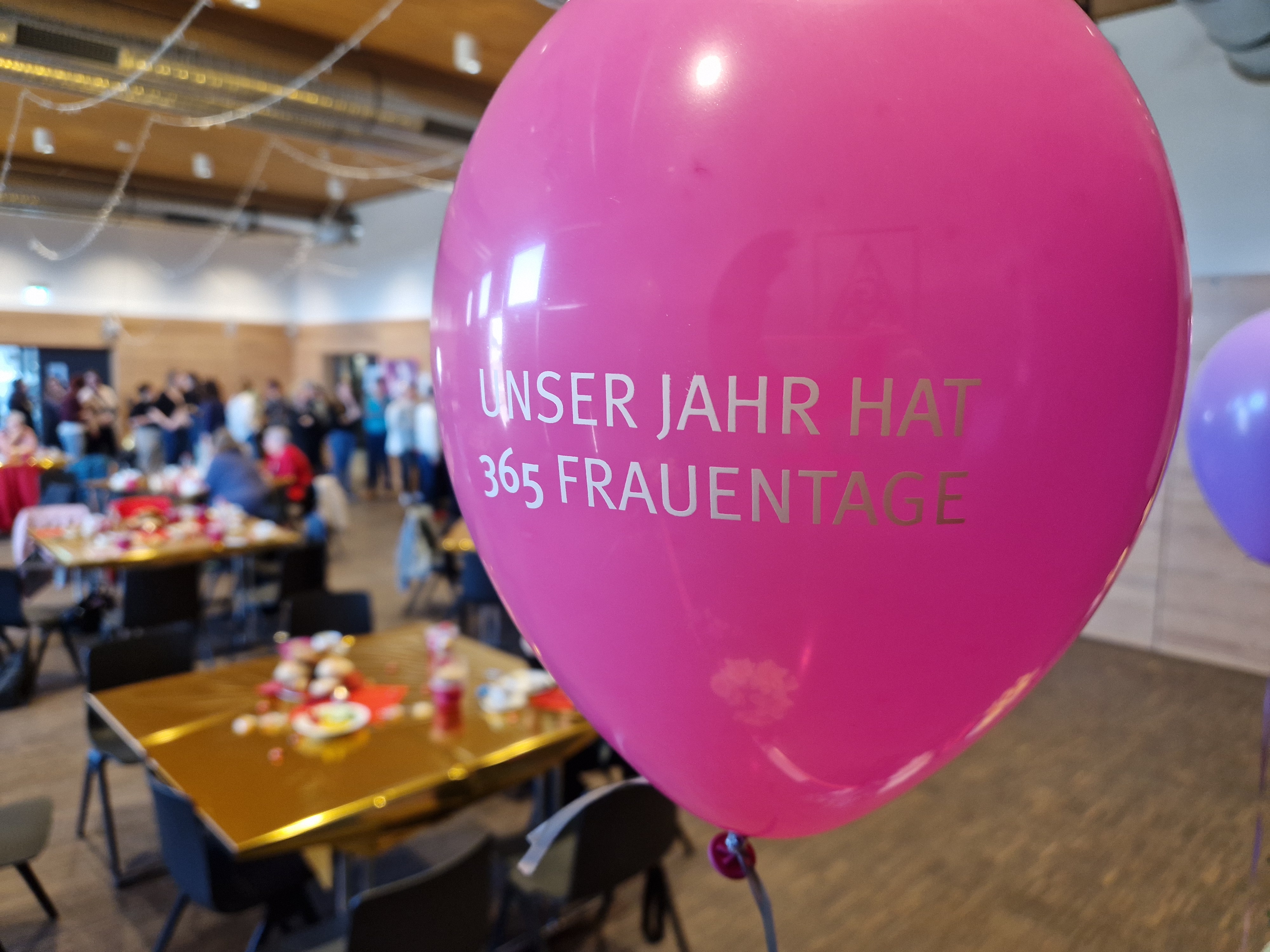 Unser Frauenfrühstück. Blick in den Raum mit einem gelben Ballon im Vordergrund mit einem Aufdruck des Frauenlogos.