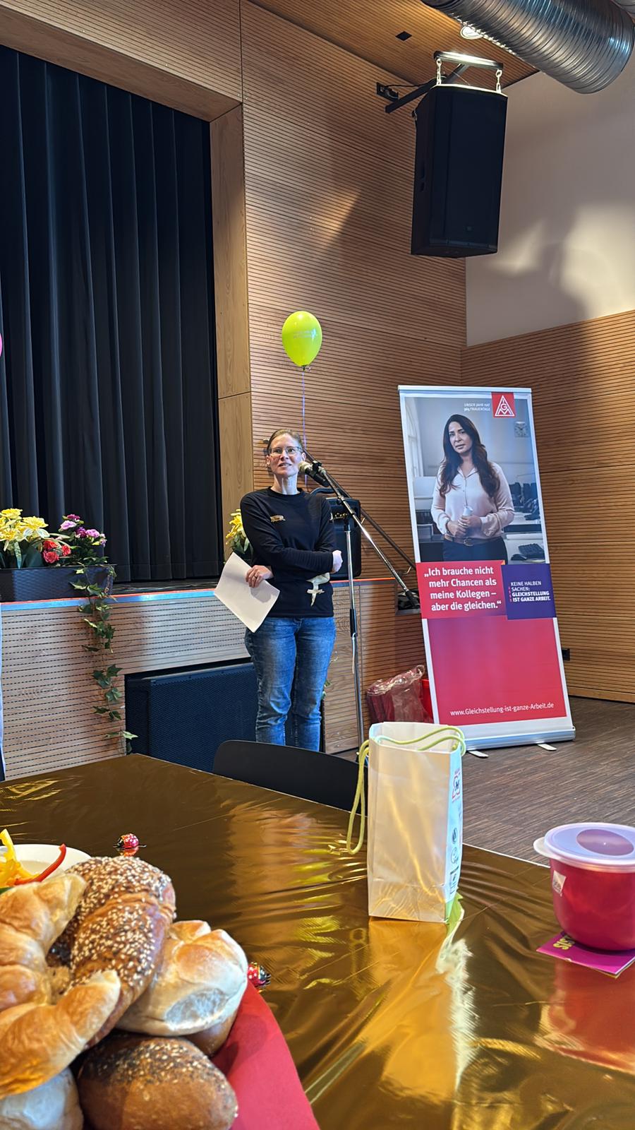 Angela Pfliegl, Gewerkschaftssekretärin der IG Metall Villingen-Schwenningen, eröffnete die Veranstaltung und begrüßte die Anwesenden – vor allem die Vertreterinnen des Vereins Frauen helfen Frauen. In ihrer Ansprache betonte sie die Bedeutung aktiver Betriebsratsgremien und die Wichtigkeit, dass sich Frauen in diese Gremien einbringen. „Wo Betriebsrätinnen mitgestalten, finden geschlechtsspezifische Themen wie Vereinbarkeit von Familie und Beruf oder flexible Arbeitszeitmodelle deutlich häufiger Platz auf der Tagesordnung“, so Pfliegl. Sie rief die Frauen dazu auf, die kommenden Betriebsratswahlen wahrzunehmen und sich dort einzubringen, wo es möglich ist.